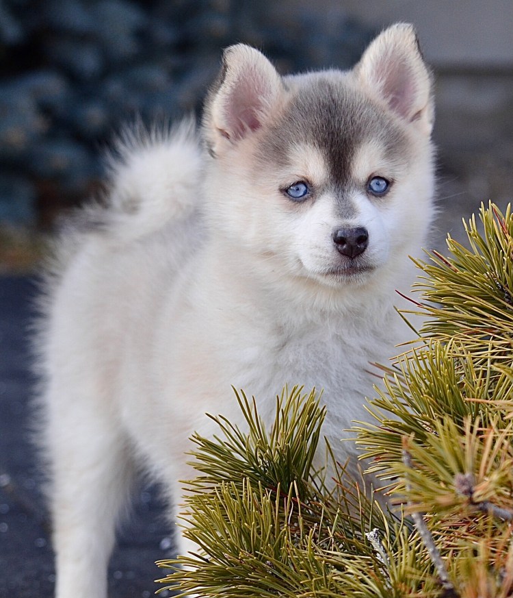 And finally… we are so fortunate to have been entrusted with a beautiful and rare blue F2 Pomsky, Aoife (pronounced “Ee-fa”), who is an adorable little spitfire at only 5.66 pounds, charting to be around 16 pounds. She also carries brown to make lavender puppies as well! We love her reverse husky mask as well (the dark stripe going down her nose). We are super excited to have her in our future breeding program!