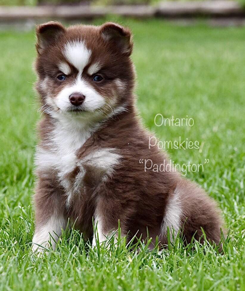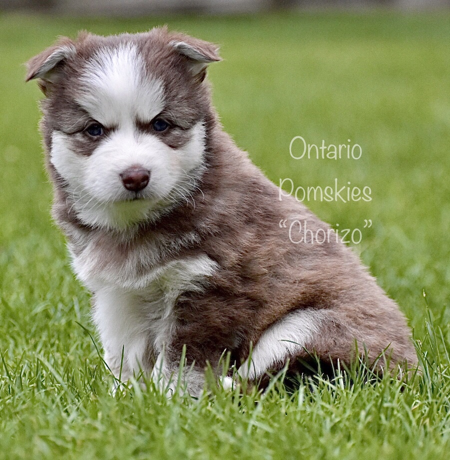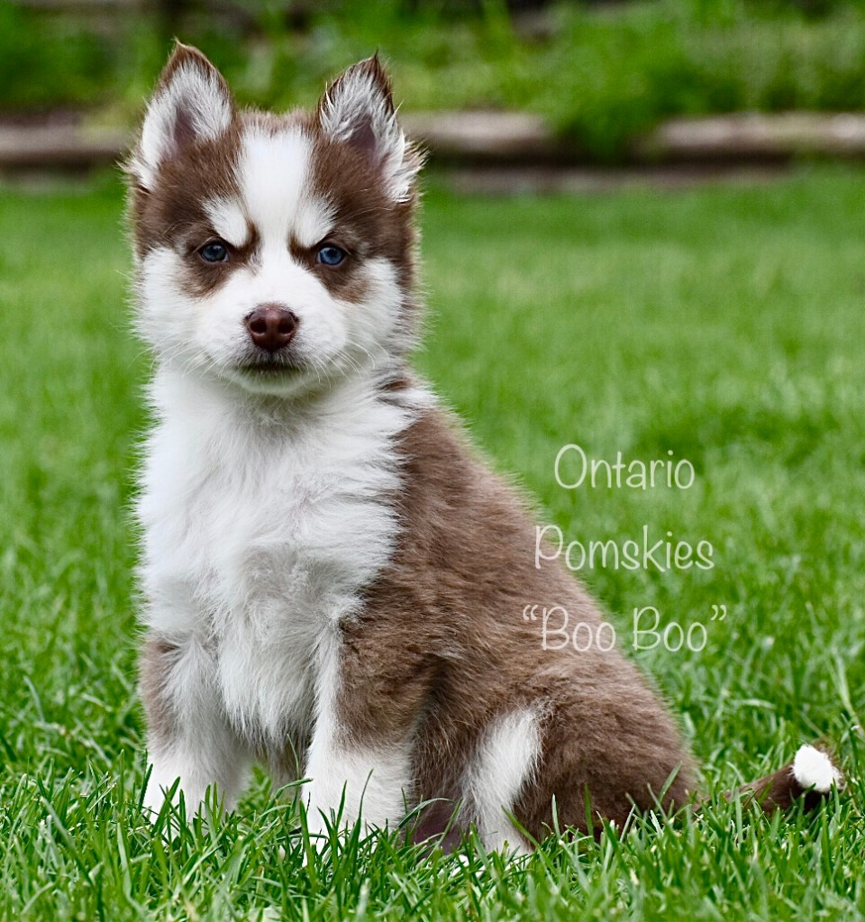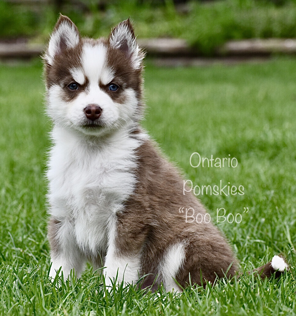 Most of our pups have now been chosen or are under contract. We do have Boo Boo, who will be 8 weeks old next Saturday, May 28, who might be available. He is priced at $4,000 Canadian, is charting to be 17-23 pounds, has blue parti eyes (partial green/hazel as well), appears to have a plush coat, loves children, loves affection, is more easy going and playful but not hyper, but he can be more vocal when he’s hungry! Please contact us at ontariopomskypuppies@gmail.com, or fill out a Qualification Application if you are interested in adopting Boo Boo and we will be happy to set up a meeting with him!
