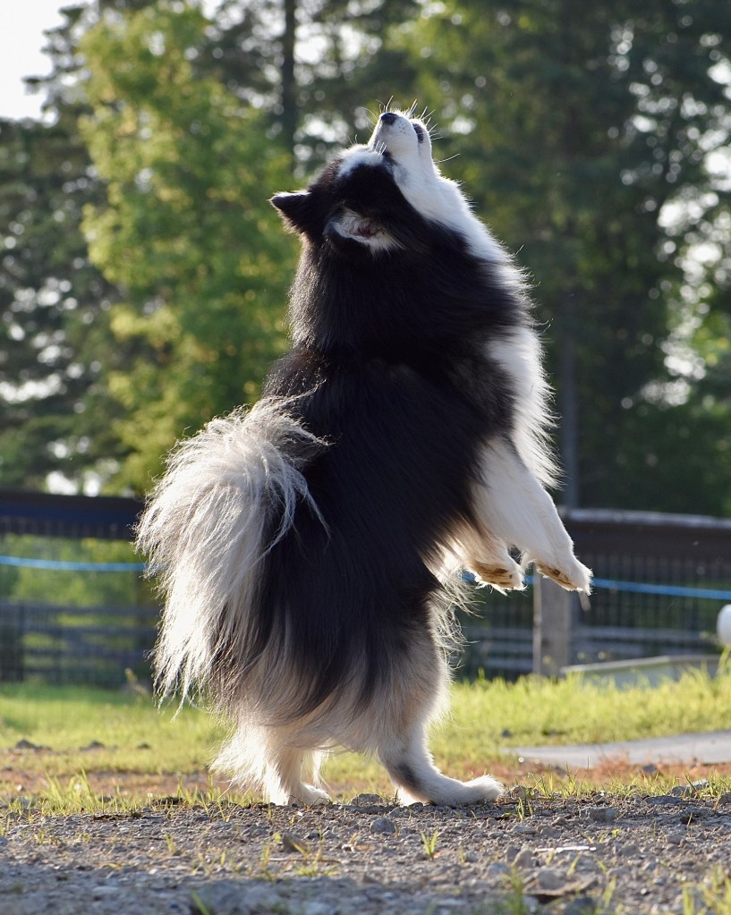Several of our Pomskies that we have bred are certified therapy animals. Others have won Conformation classes, have obtained titles such as Advanced Trick Dog (ATD), and have competed in fitness training including Agility.