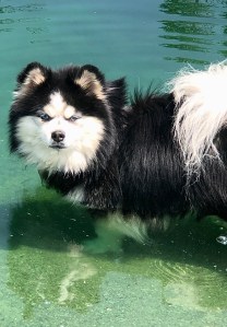 Some of our Pomskies very much enjoy water whereas others prefer to simply wade in a shallow pool. Pomskies should be bathed seasonally as excessive bathing can lead to more knotting/matting of their double coats and drying of their skin, but they can be washed if they become muddy or have salt in their paws from winter walks, etc.