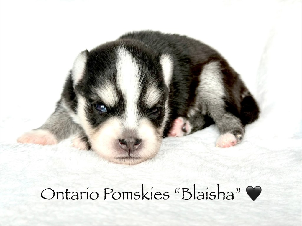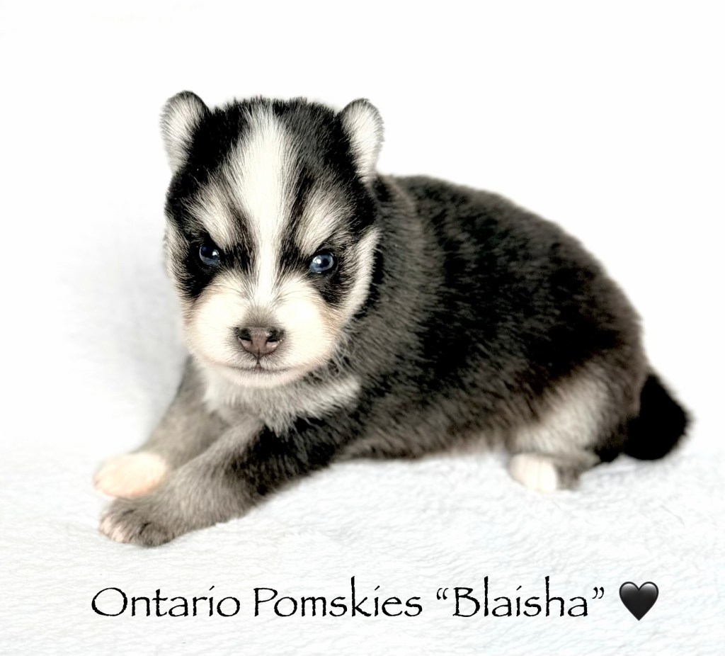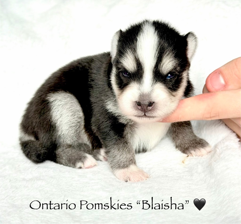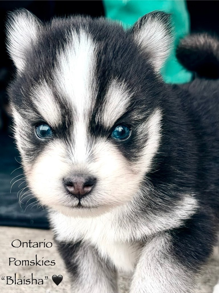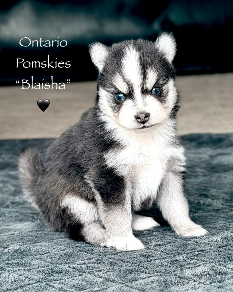 Leilani (20 pounds) silver F3 x Creed (16 pounds) black F3. F4 Pomsky puppies anticipated for summer 2026. Coat colour options: black, grey/silver, red/brown. Eye colour options: Blue. Size options: Toy to Standard.