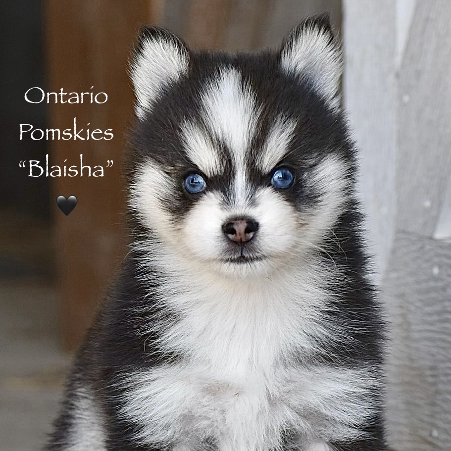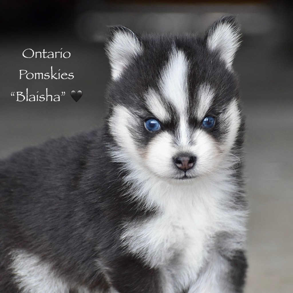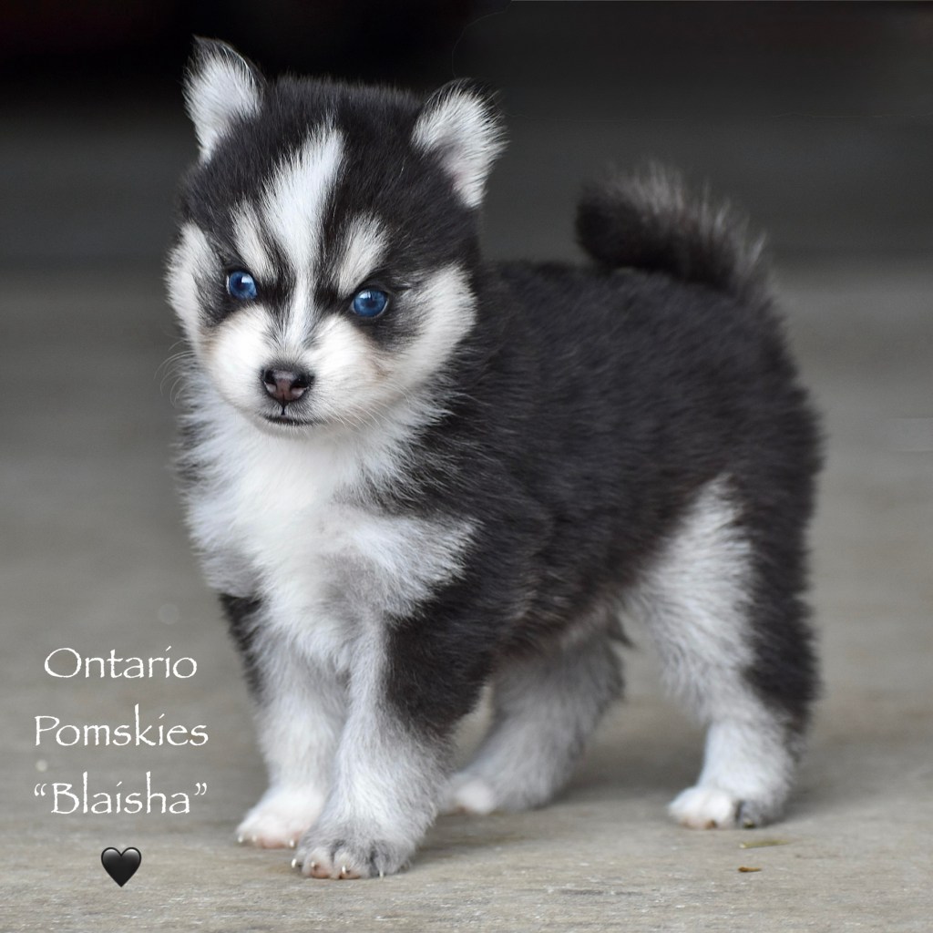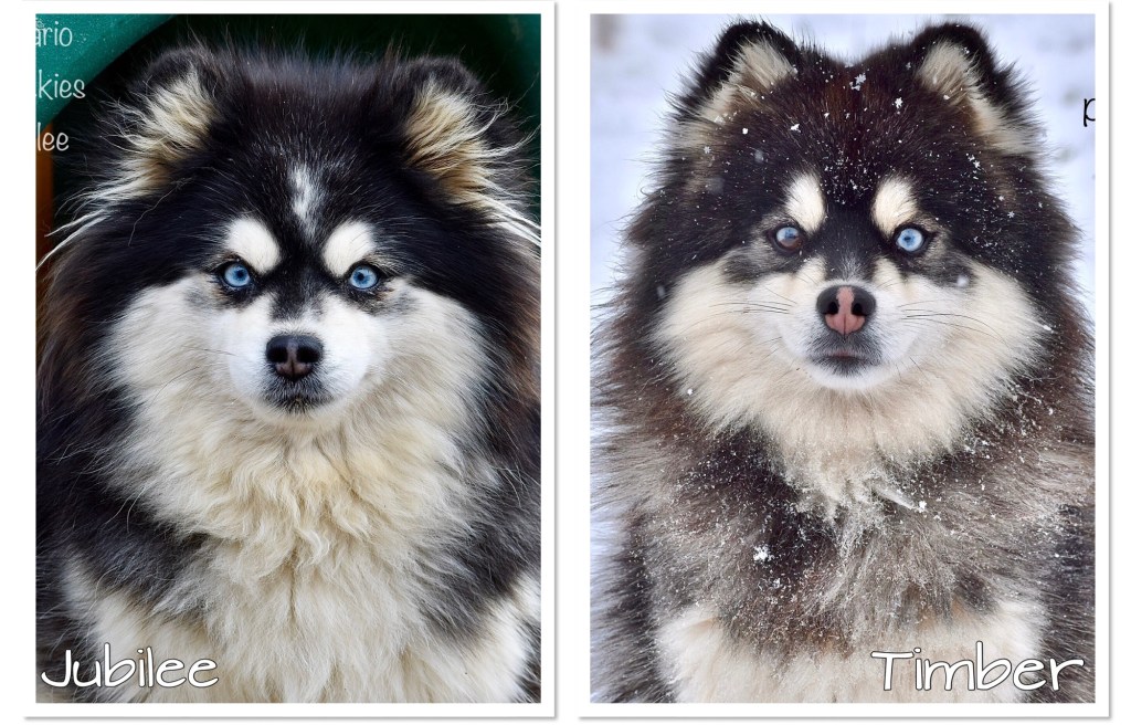 Jubilee (10 pounds) black F4x x Timber (14.5 pounds) grey F3. F4x Pomsky puppies anticipated for June 2026. Coat colour options: black, grey/silver. Eye colour options: Blue, parti. Size options: Toy to Mini.