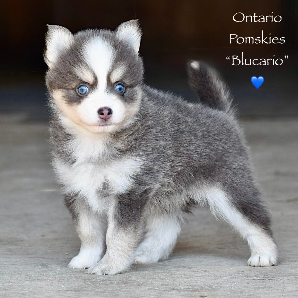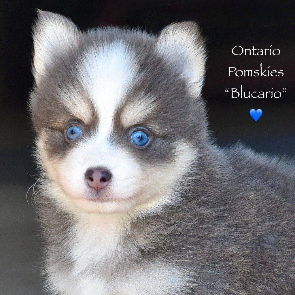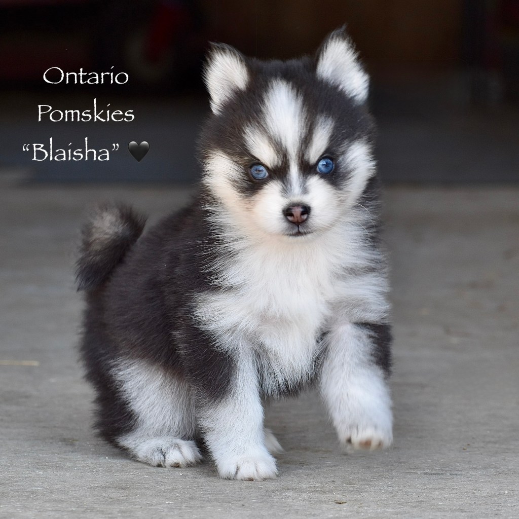 Jubilee (10 pounds) black F4x x Timber (14.5 pounds) grey F3. F4x Pomsky puppies anticipated for June 2026. Coat colour options: black, grey/silver. Eye colour options: Blue, parti. Size options: Toy to Mini.