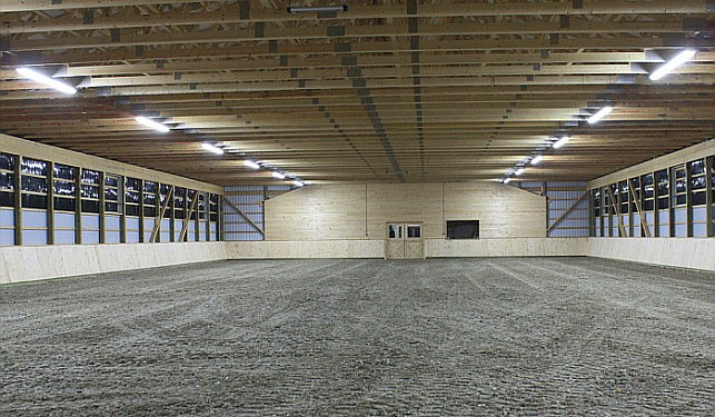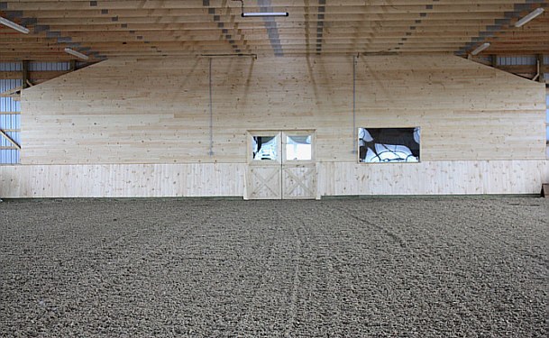 80’x180′ dust-free premium GGT fibre footing, 8x slider windows, insulated ceiling, harrowed regularly, mirrors, skylight, jumps and dressage letters, infrared heat lamps
